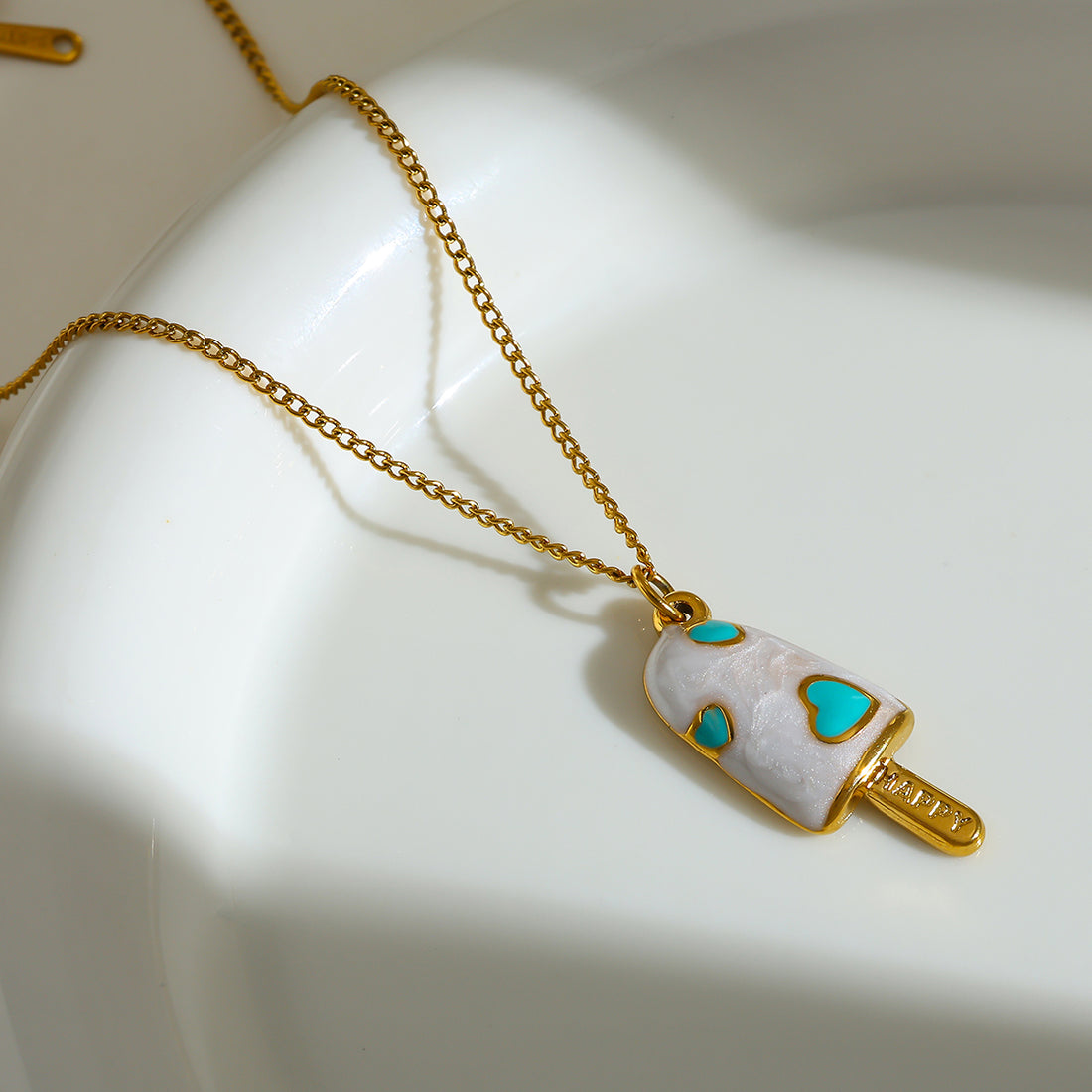 Golden Anti-Tarnish Embossed Heart Ice Cream Pendant Necklace, Blue