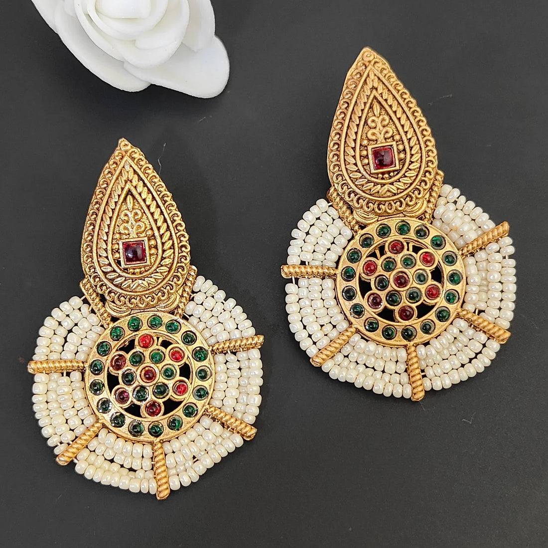 Contemporary gold-plated ruby & green stone-studded white seed beaded traditional earrings for women & girlsMaterial:...
