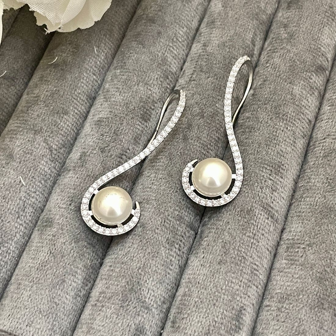 Rhodium-Plated American Diamond Pearl Embellished Drop Earrings
