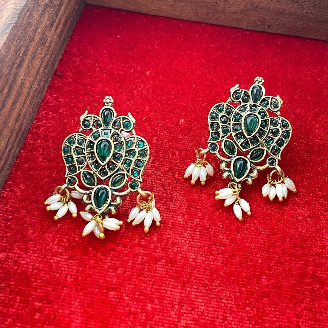 Introducing our Feather Design Earrings, featuring a traditional Chakri design with white beads and green...