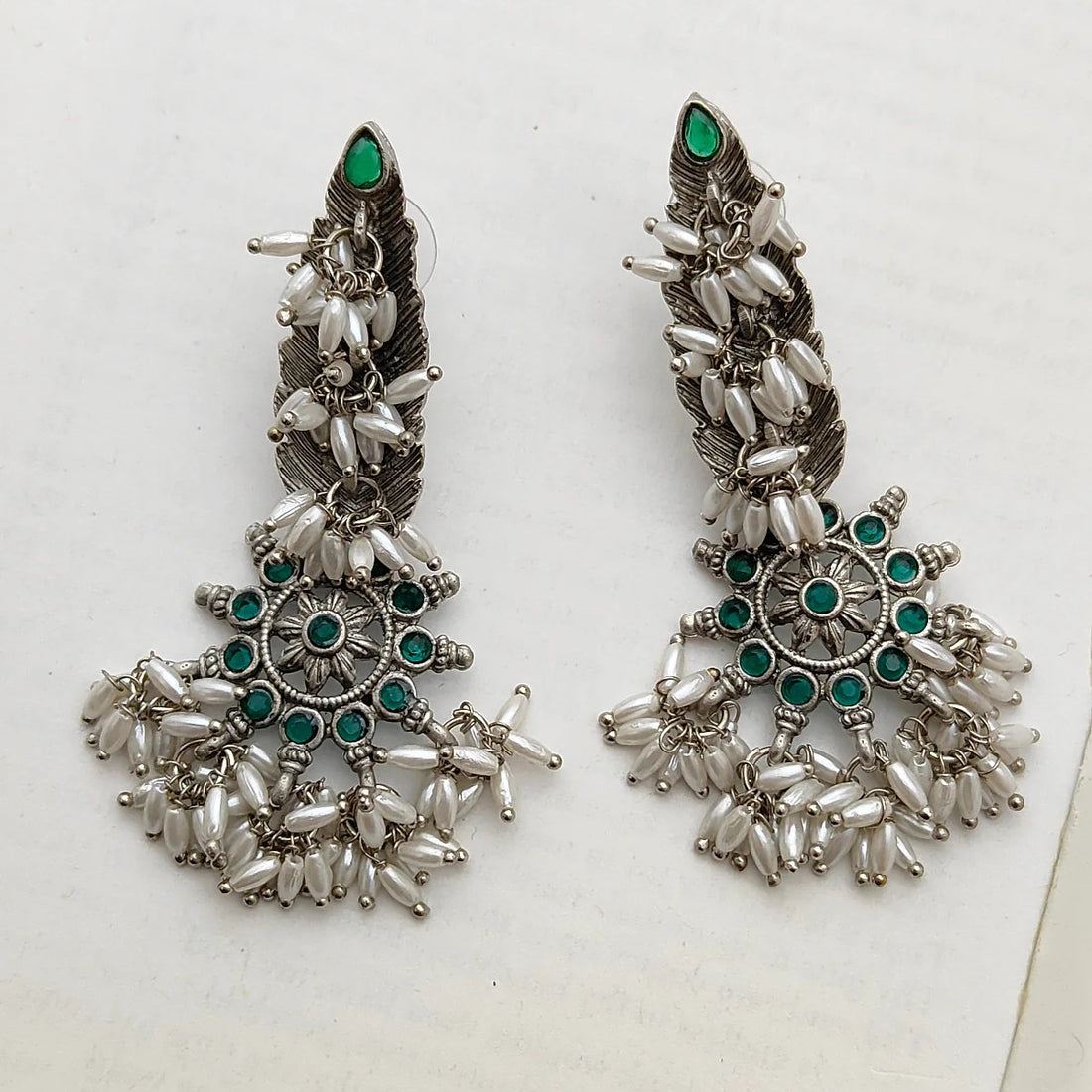 Oxidised Silver-Plated Green Stone-Studded Dangler Earrings