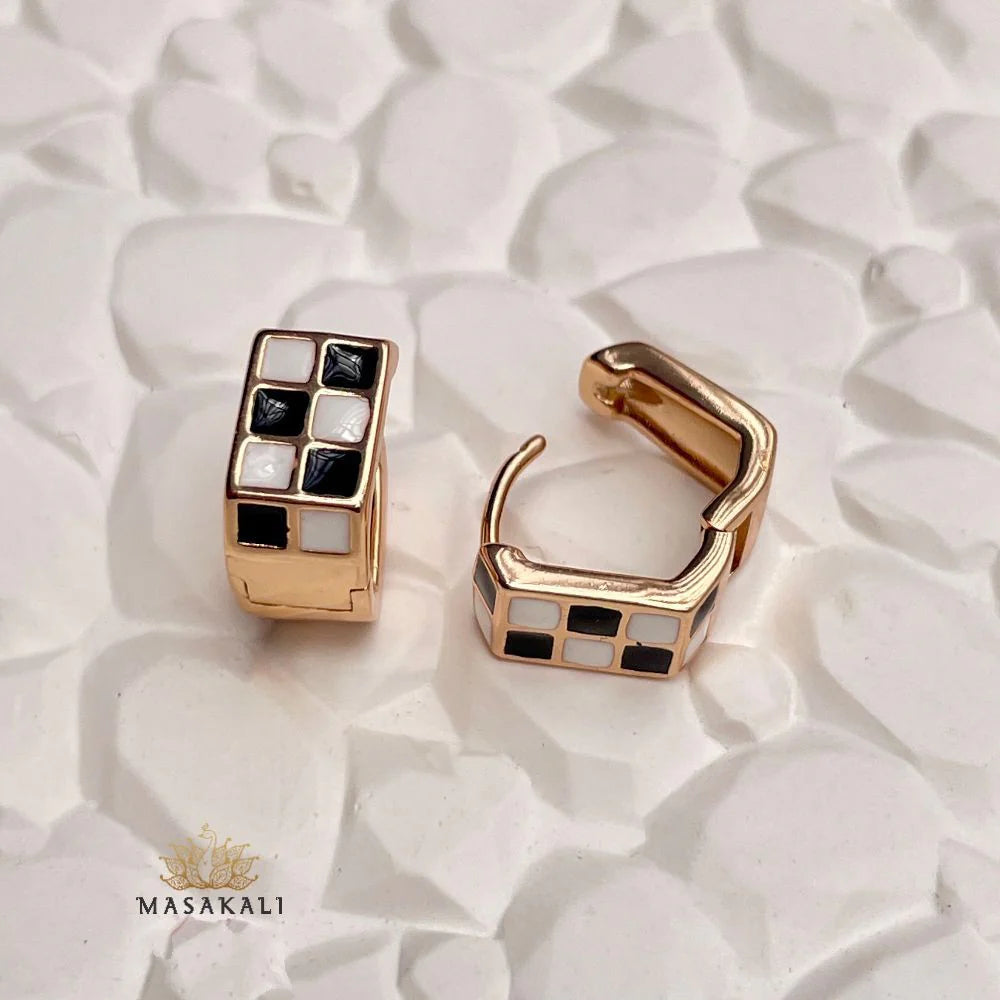 Black & White Checkered Hoops, Women's Trendy Huggie Earrings, Dainty Gold Hoop Earrings, Checkerboard enameled Jewellery, Gifts for Her, Popular Jewelry Styles for Girls
