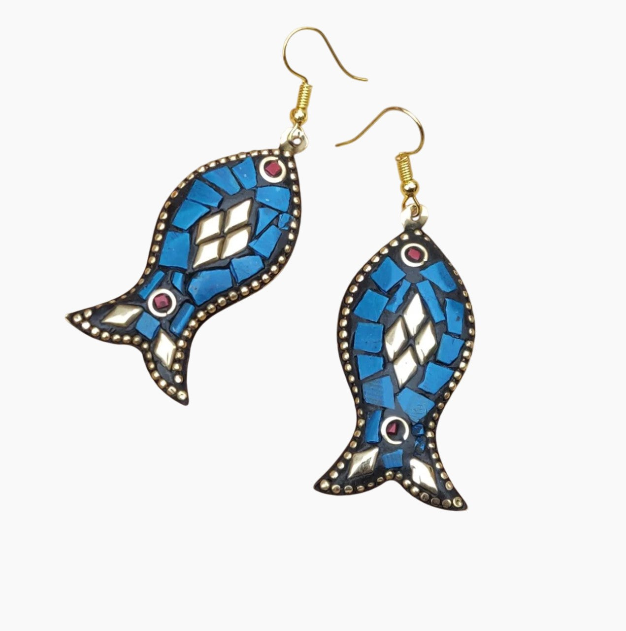 These drop earrings feature intricate Jaipuri lac work, shaped like elegant fish and finished in a striking blue mosaic design. Equipped with fish hook closures, they ensure comfortable and secure wear. Combining traditional craftsmanship with a unique motif, these earrings make a refined statement for any occasion.