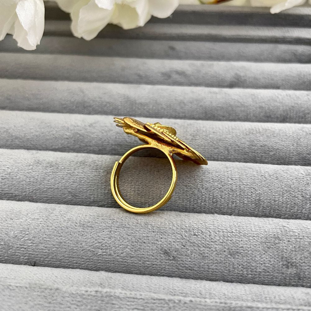 Antique gold-toned coin Goddess Lakshmi South Indian temple ring for women & girls. Made with high-quality materials, it is adjustable to fit any finger. A perfect addition to your temple ring collection.