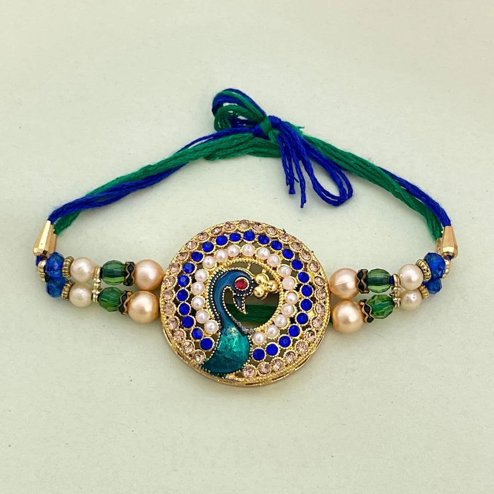Masakali Gold-Plated Peacock Stone-Studded & Beaded Thread Rakhi For Brother