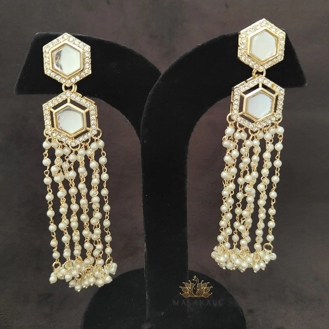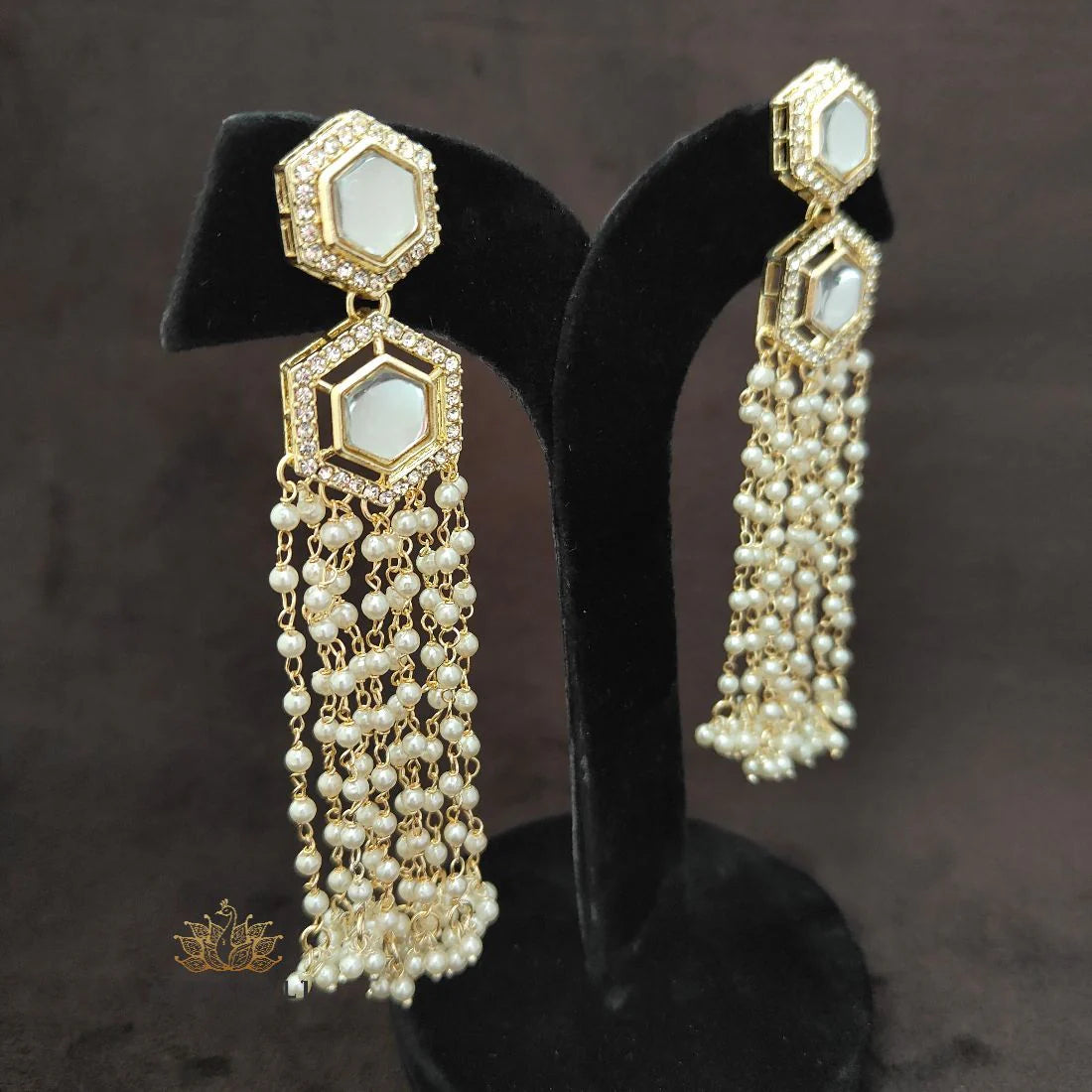 Gold-toned, white geometric shaped drop earrings, has kundan & pearls