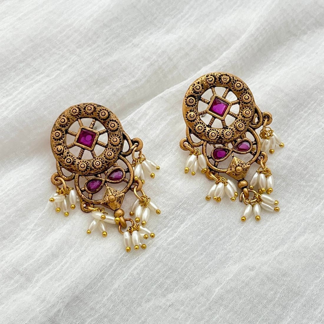 Gold-Toned Ruby Stone-Studded Traditional Guttapusalu Earrings