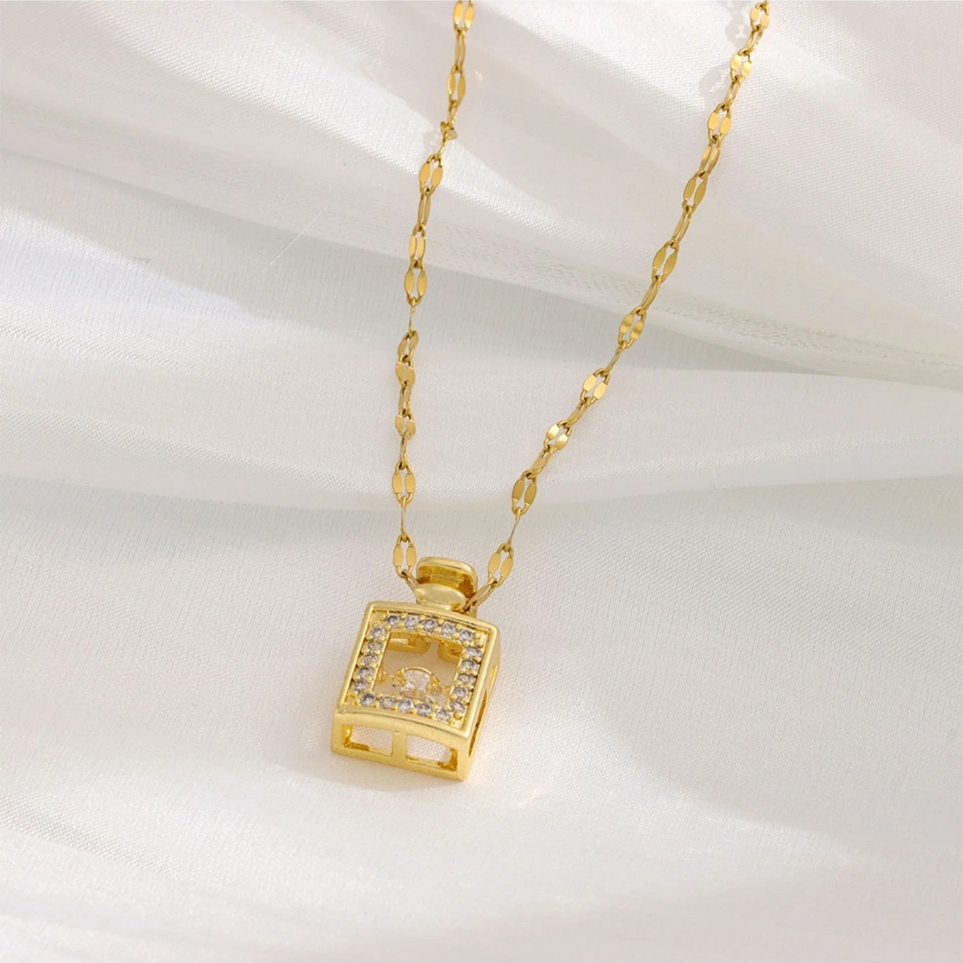 Golden Perfume Bottle Dancing Diamond Pendant Necklace