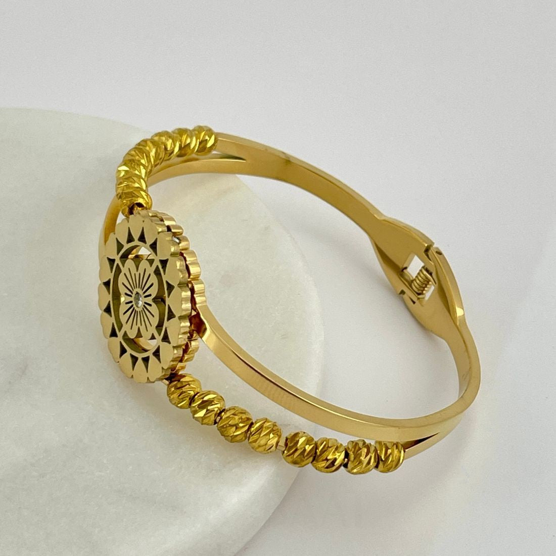 Gold-plated heart charm stone-studded openable bangle bracelet for women & girls.