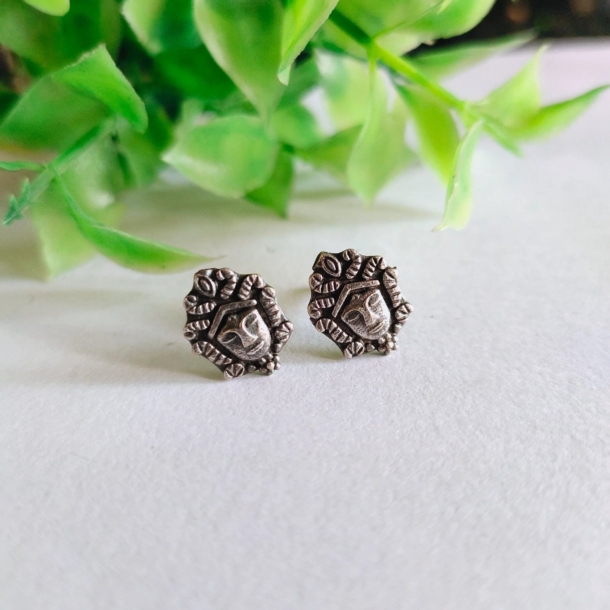 Embrace spiritual elegance with these silver-oxidised Goddess Durga Maa stud earrings. Meticulously crafted to capture the divine energy, their timeless design offers a subtle yet powerful symbol of protection and strength. Perfect for daily wear, these earrings blend traditional reverence with contemporary style, making them a meaningful addition to your collection.