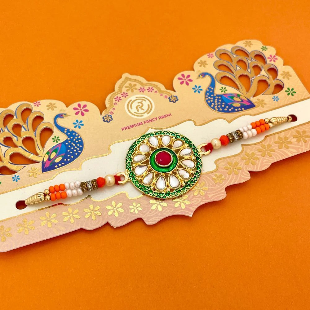 Red & Green Stone Studded Fancy Kundan Rakhi